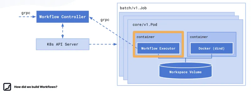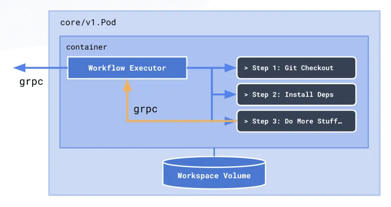 Workflow scheduling is handled by Kubernetes, specifically through a “Workflow Controller” that interacts with the K8s API Server and triggers Kubernetes Pods. Each Pod contains a Workflow executor and sidecar containers. All containers in the Nx Cloud workflow share a workspace volume for collaborative access. This allows for interesting optimizations in terms of sharing node_modules and restoring cache results.