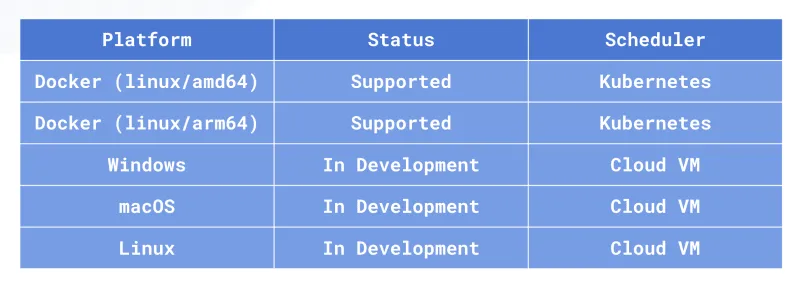 Windows, macOS and Linux is currently in development which will use a Cloud VM scheduler on the cloud of your choice.