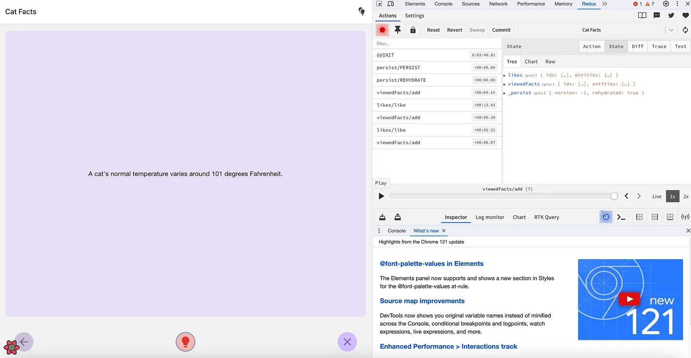 Or you can run npx nx serve cats to launch the app in web view. Then you can use Redux Devtools and debug the native app like a web app: