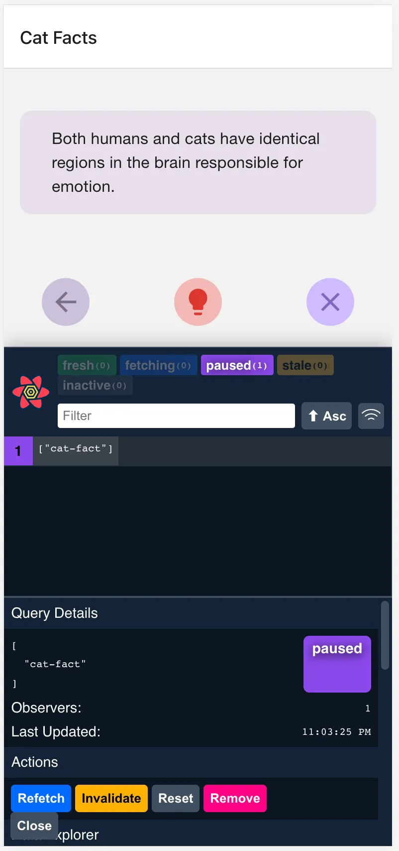 If you open my Expo app on the web by running nx start cats and choose the options Press w │ open web, you should be able to use the dev tools and see the state of my react queries: